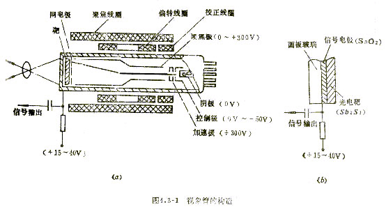 视象管是空器件,它主要包括光电靶和电子枪两大部分。管外套有偏转、聚焦和校正线圈,利用它们产生的磁场来实现管中电子束的偏转、聚焦和方向校正。其剖面原理图如图