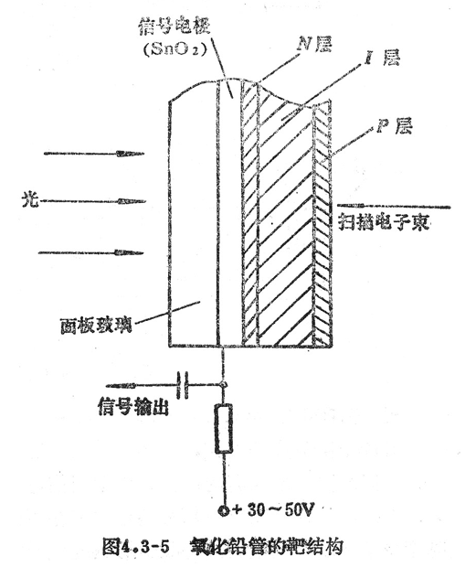 氧化铅管除光电靶与视象管不同外,其余结构和工作原理均与视象管相同。氧化铅管的光电靶如图4.3-5所示,它在透明导电膜上蒸镀了三层氧化铅薄膜。其中间一层是厚10~20um的纯净的PbO本征层,称为I层;在扫描侧是掺有杂质的N型PbO 层,称为N层。P层和N型极薄,光电转换主要在I层进行,这三层构成PIN二极管结构。