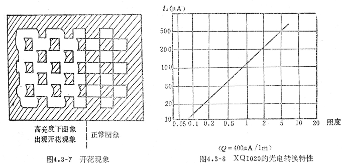 表示。PbO管的γ值为0.85~0.95,近似为1。所以其光电转换特性为一条45°的直线,如图4.3-8所示。由于这一特性,因而使得在彩色摄象机易于满足不同电平的彩色平衡。