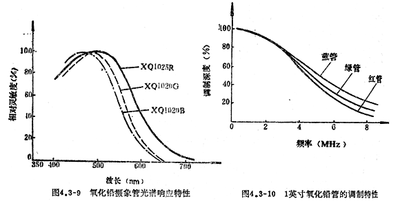 彩色摄色机对红(R)、绿(G)、蓝(B)三种管子的光谱特性有不同的要求,所以PbO管的R、G(L)、B管是专用的,在管脚都有注明,使用时应予注意。图4.3-9中示出红、绿、蓝三种PbO管的光谱特性。