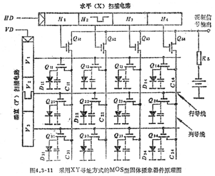 图4.3-11是采用了XY寻址方式的MOS型固体摄象器的原理图。其光电转换利用PN结光电效应。当光入射某个象素所对应的光敏二极管(例如D22)上,就在与其并联的微小电容(C22)上存贮电荷而形成信号电压。它的信号读取是采用XY寻址方式的。