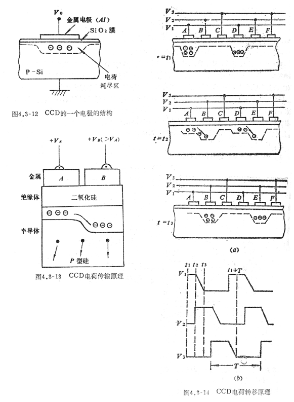 图4.3-13中加在电极A上的电压产生一个表面电位,它可以改变半导体表面的类型。当在电极B上加一更大的电压时,则在电极B的下部就产生更深的位阱。于是,少数载流子就从A流到B,从而完成了电荷的转移。