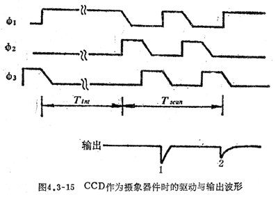 图4.3-14所示器件用图4.3-15的一组时钟来驱动,就可作为摄象器使用。在Tint时间范围内,V1处于高电平,而V2和V3处于低电平,两个V1电极下产生了势阱。设想有一个幅图象照在器件上,在D电极附近是强光,而在A电极附近是弱光,只要落到器件上的光子下的势阱中。因为D电极附近的入射光较强,所以D电极下的势阱的收集的电子较多。在Tscan期间,电荷包被传输到输出端,给出图4.3-15中的输出信号,其大小与入射到器件相应位置上的光强度成正比。这就完成了光电转换。