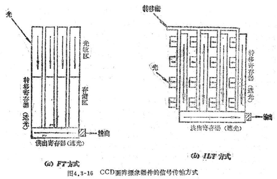 面阵CCD器件常采用帧转移(FT)和行间转移(LLT)两种方式来读出图象信息,如图4.3-16所用。