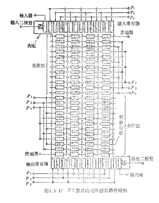 图(a)帧转移方式,其详细电路结构如图4.3-17所示。这种器件由象素数量相同的受光部(摄象区)和存贮以及水平移位寄存器和输出电路组成。在某一场周期内,对应光的输入在受光部所产生的信号电荷,用附加在三相电极上的交迭脉冲在场消隐期间内一一对应地平移到存贮部。在下一场正程期间,受光部又对下一场的光照产生的电荷进行积累。存贮部结构与受光部相同,它存贮上一场的图象信号,并在行消隐期间内,在其三相电极上,加上一个周期性的三相交迭行步进脉冲,使存贮区的信号每经过一行的时间,便向水平移位寄存器平移一行。水平移位寄存器也是三相操作,在行正程期间,它的三相电极上附加水平传送交迭脉冲,使一行的图象信号通过输出电路顺次输出。